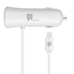 Car charger with USB-C connector and extra USB that can deliver 3.4A output for fast charging suitable for most of Samsung, Blackberry, LG, HTC, Huawei models and others using attached cable